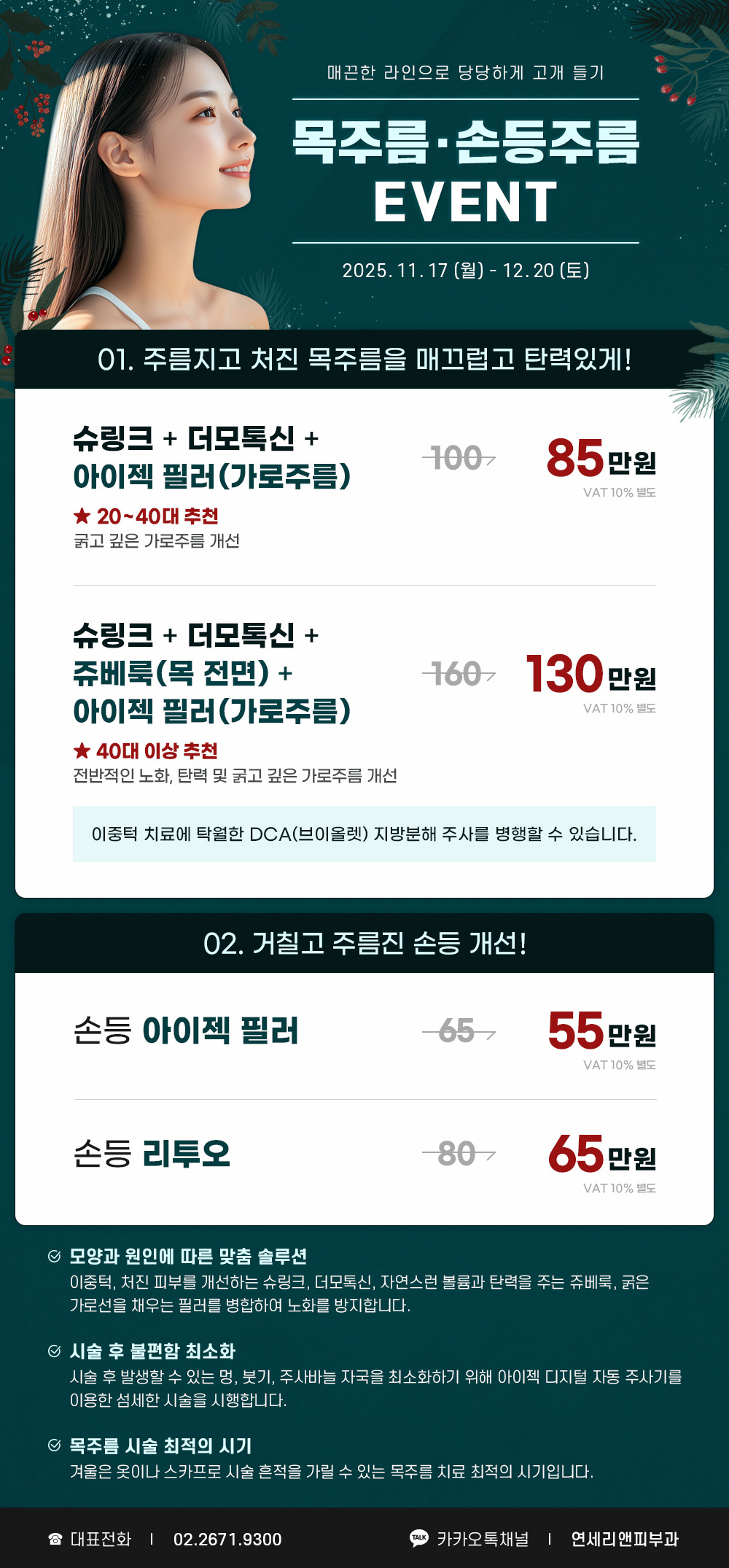 ![]() ◈ 목주름, 손등주름 EVENT ◈ 2025년 11월 17일(월) ~ 12월 20일(토) ※ 디지털 자동 주사기 '아이젝(i-ject)' 시술 확실한 주사 통증 , 주사 자국 감소 효과 ▶ 주름지고 처진 목주름을 매끄럽고 탄력있게! ▷ 슈링크+더모톡신+아이젝 필러(가로주름) : 100만원 -> 85만원 굵고 깊은 가로주름 개선 (20~40대 추천) ▷ 슈링크+더모톡신+쥬베룩(목 전면)+아이젝 필러(가로주름) : 160만원 -> 130만원 전반적인 노화,탄력 및 굵고 깊은 가로주름개선 (40대이상 추천) * 이중턱 치료에 탁월한 DCA(브이올렛) 지방분해 주사를 병행할수 있습니다. ▶ 거칠고 주름진 손등 개선 ▷ 손등 아이젝 필러: 65만원 -> 55만원 ▷ 손등 리투오: 80만원 -> 65만원 1. 모양과 원인에 따른 맞춤 솔루션 이중턱, 처진 피부를 개선하는 슈링크, 더모톡신, 자연스런 볼륨과 탄력을 주는 쥬베룩, 굵은 가로선을 채우는 필러를 병합하여 노화를 방지합니다. 2. 시술 후 불편함 최소화 시술 후 발생할 수 있는 멍, 붓기, 주사바늘 자국을 최소화하기 위해 아이젝 디지털 주사기를 이용한 섬세한 시술을 시행합니다. 3. 목주름 시술 최적의 시기 겨울은 옷이나 스카프로 시술 흔적을 가릴 수 있는 목주름 치료 최적의 시기입니다. ※ 11월26일~12월5일 휴진 ※ VAT 10% 별도 홈페이지: www.leeand.co.kr 카카오플러스친구:연세리앤피부과 문의전화: 02-2671-9300 |