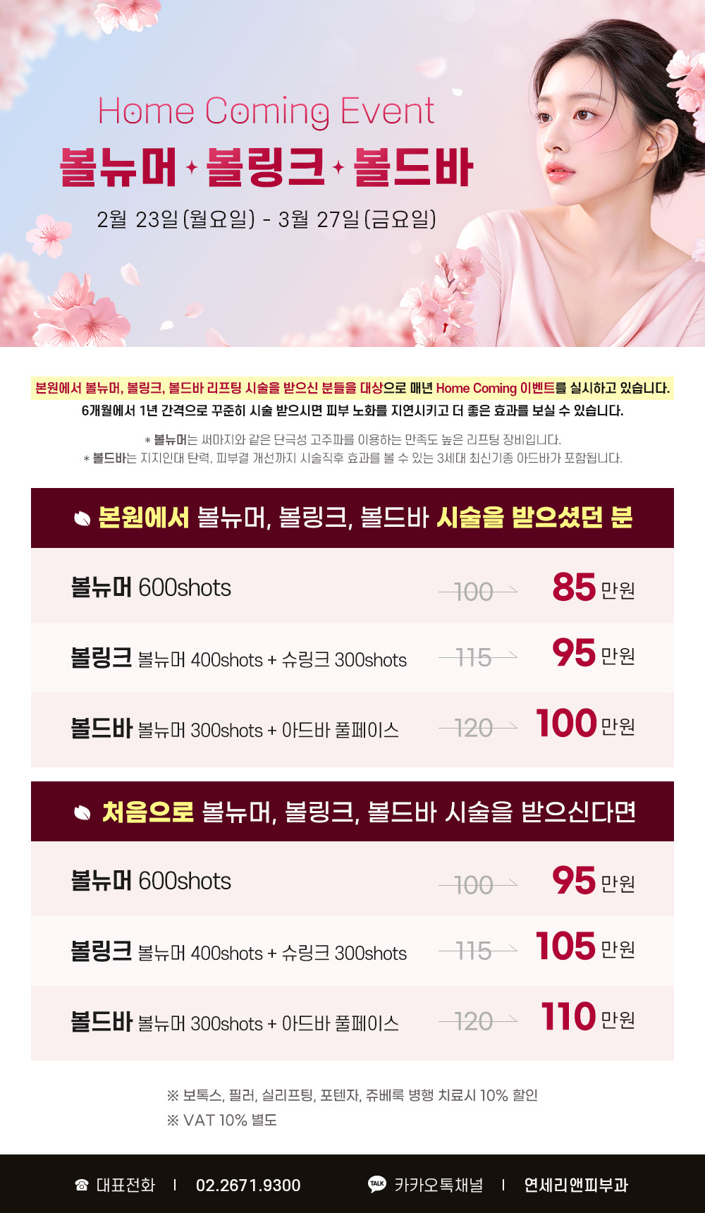 본원에서 볼뉴머, 볼링크, 볼드바 리프팅 시술을 받으신 분들을 대상으로 매년 Home Coming 이벤트를 실시하고 있습니다. 6개월에서 1년 간격으로 꾸준히 시술 받으시면 피부노화를 지연시키고 더 좋은 효과를 보실 수 있습니다. * 볼뉴머는 써마지와 같은 단극성 고주파를 이용하는 만족도 높은 리프팅 장비입니다. * 볼드바는 지지인대 탄력, 피부결 개선까지 시술직후 효과를 볼 수 있는 3세대 최신기종 아드바가 포함됩니다. ▶ 본원에서 볼뉴머, 볼링크, 볼드바 시술을 받으셨던 분 볼뉴머 600shots 100만원 → 85만원 볼링크(볼뉴머 400shots + 슈링크 300shots) 115만원 → 95만원 볼드바 (볼뉴머 300shots + 아드바 풀페이스) 120만원 → 100만원 ▶ 처음으로 볼뉴머, 볼링크, 볼드바 시술을 받으신다면 볼뉴머 600shots 100만원 → 95만원 볼링크(볼뉴머 400shots + 슈링크 300shots) 115만원 → 105만원 볼드바 (볼뉴머 300shots + 아드바 풀페이스) 120만원 → 110만원 ※ 보톡스, 필러, 실리프팅, 포텐자, 쥬베룩 병행 치료시 10% 할인 ※ VAT 10% 별도 |
